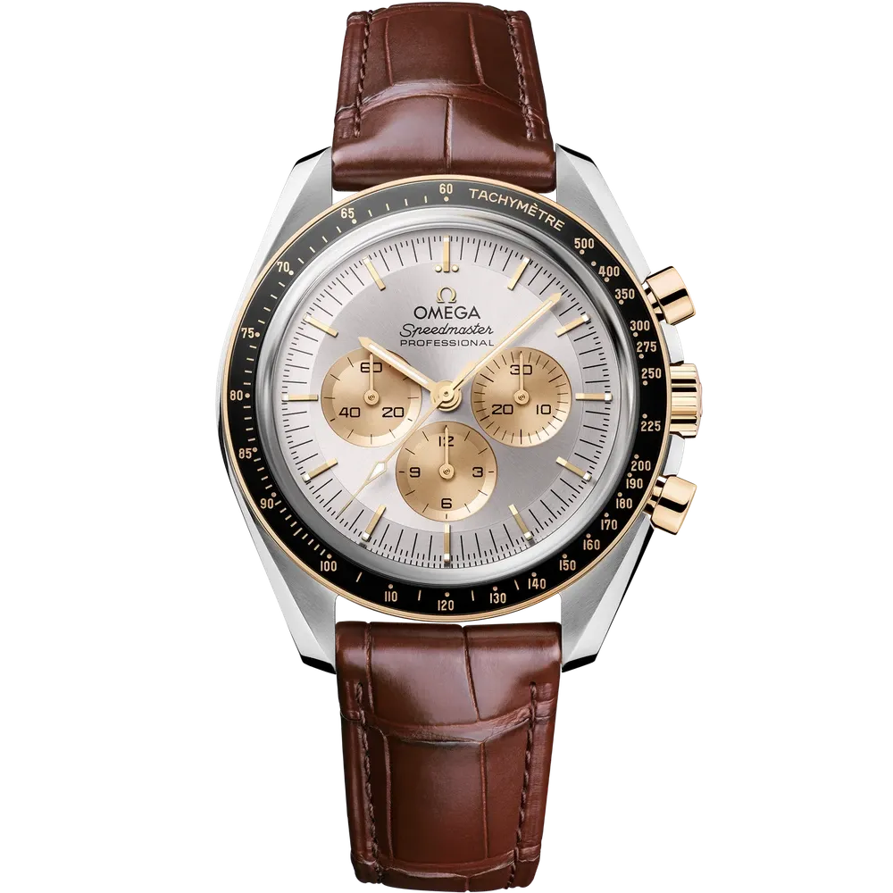 Silver dial watch on steel Moonshine™ gold case with Alligator bracelet Speedmaster Moonwatch Professional 42 mm, steel Moonshine™ gold on alligator Speedmaster Moonwatch Professional31023425002001